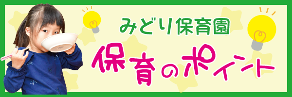 みどり保育園は、乳幼児が生涯にわたる人間形成の基礎を培う大切なこの時期に、一人ひとりを優しく温かい目で見守ることを常に心がけております。