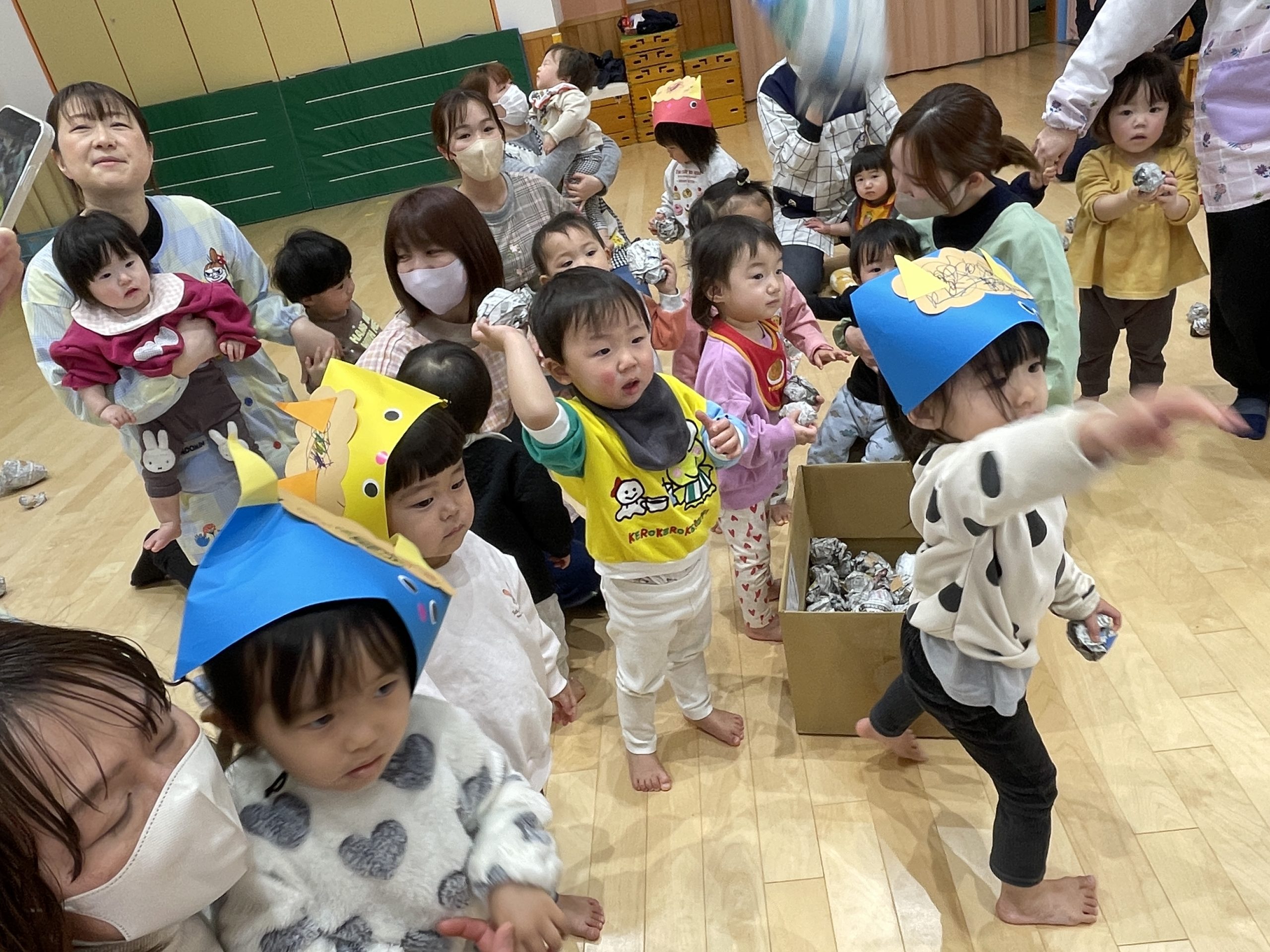 ドキドキしながらも新聞ボールを「えい!」「おにはそと!」投げました!
